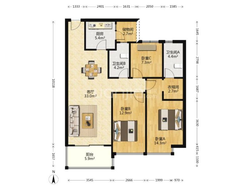 3室2厅 1厨 1卫 1阳台